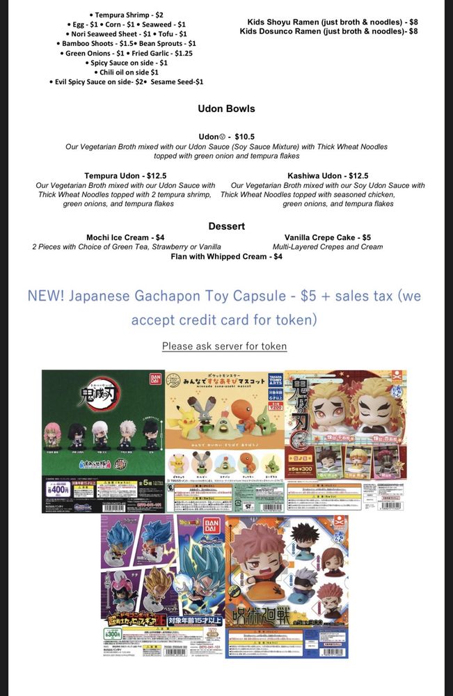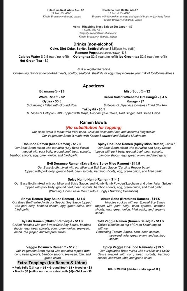 “ Cute cozy spot for some good ramen! My husband had the Evil Dunsuco ramen and I had the spicy dunsuco ramen. The spicy ramen was just enough heat for me, however the evil one was too spicy. My husband's nose started running...haha...but he loves spicy food and ate the whole thing! He said that he's never had a ramen that was that spicy. It was good, he said, but not sure if he'd get it again. He might just do the spicy ramen and ask for extra spice on the side if he wants to add a little more heat. We also had the gyoza and edamame which are our favorite and go-to appetizers. My 8 yr old son had a kids ramen. Actually not sure if they had a kids menu, but we ordered a basic dunsuco ramen that was not spicy with egg, seaweed and shrimp tempura on the side. He devoured the whole thing. Food came out quick, and our server was helpful in helping us decide which ramen to get since it was our first time there. Highly recommend checking them out. ”